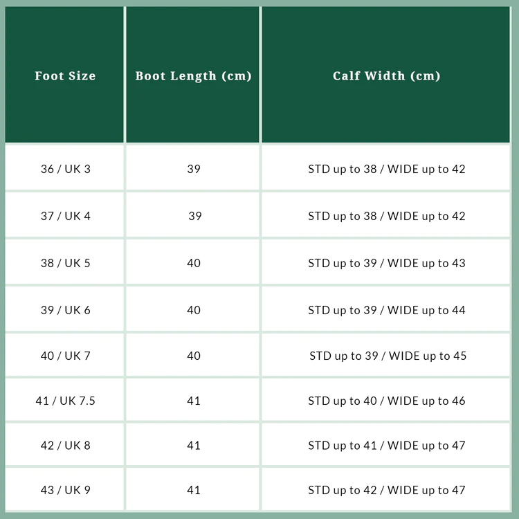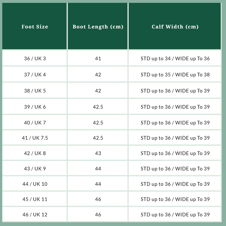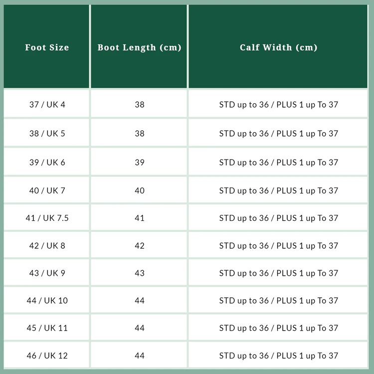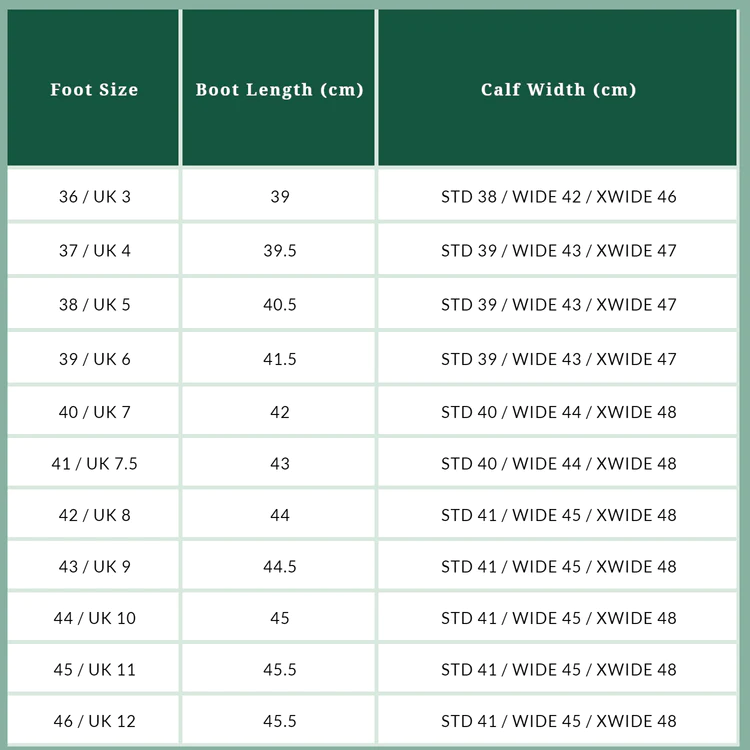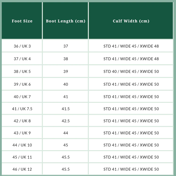 Some of our styles have several calf options and overlap the "fit" groups; so do check the other charts in-case there's more choice available for your measurements.